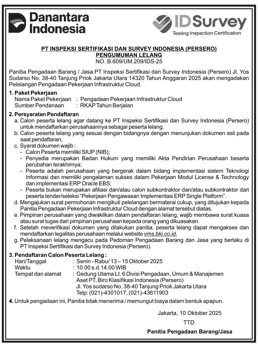 Pengumuman Lelang Pekerjaan Pengawasan Implementasi ERP Single Platform IDSurvey